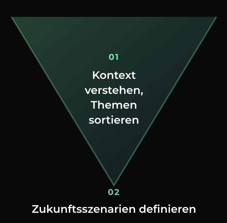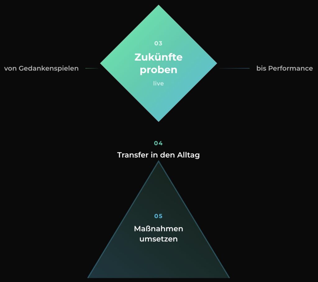 Wir erarbeiten gemeinsam mit Ihnen Ihre Fragestellungen, erstellen positive, negative und realistische Zukunftsszenarien und proben mit Ihnen die Zukunft.